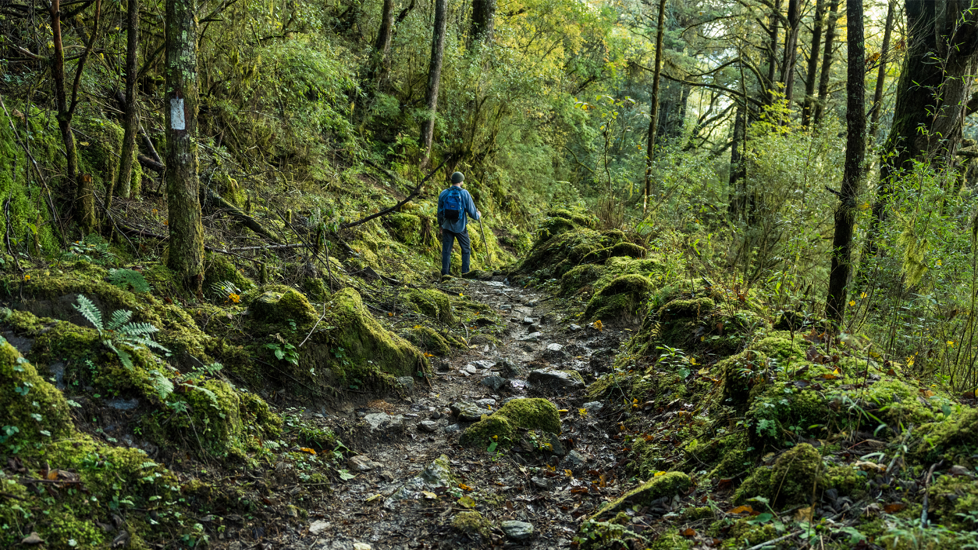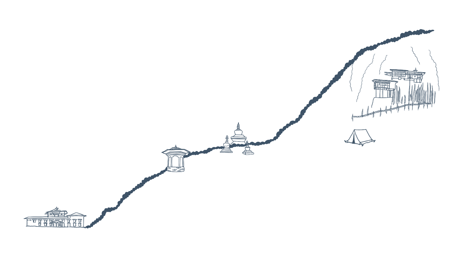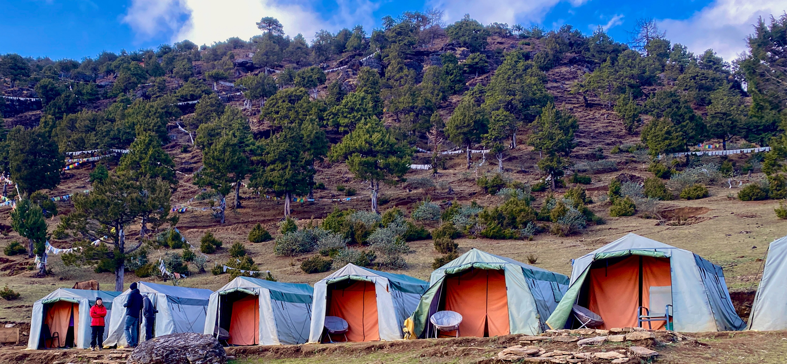 The trek begins with a 1-hour drive from Paro to Sang Choekor Buddhist College where you start walking at an altitude of about 2800m. You climb gradually upwards through blue pine and juniper forest (sadly now burnt out in a recent forest fire). After about 3 hours’ walking you will reach Chhoe Chhoe Tse Lhakhang (temple). Carry on climbing for another 20 minutes or so until you re-enter the forest. After about 40 minutes more you will emerge onto a large meadow where you will find many chortens and prayer flags. Your camp for the night is below the nearby Bumdra Monastery, at about 3800 metres, where there are wonderful views across the Himalayas. Later you can visit the monastery, and if you are feeling strong climb the 4000m peak to admire the views before returning to camp.