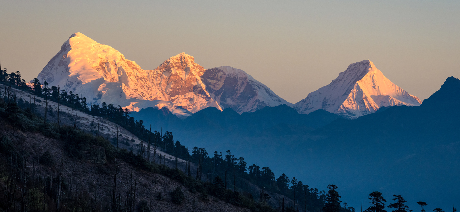 the sight of fallen trees is a reminder of the cost of progress. We turn north towards Mount Jomolhari,